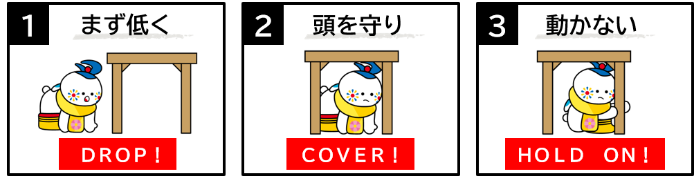 大地震が発生したという想定で、あらかじめ決めた時刻に一斉に、参加者の皆さんが「1.まず低く」、「2.頭を守り」、「3.動かない」の安全行動をとり、各家庭や会社等で、いざというときの安全行動を確認するなど短い時間でできる簡単な訓練です。