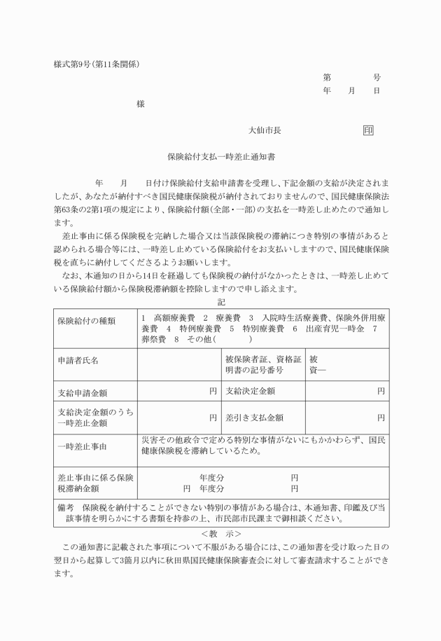 第12条 市長は、保険給付支払の一時差止めの措置を受けている世帯主が滞納している保険税を完納したとき、又は当該世帯主に係る滞納額の著しい減少、災害その他施行令第1条に定める特別の事情があると認めるときは、当該措置を解除する。この場合において、当該世帯主が滞納している保険税を一時差止めしている保険給付の額から控除するものとする。