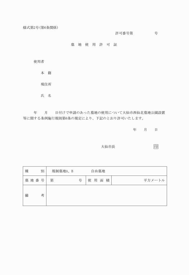 ○大仙市西仙北墓地公園設置等に関する条例施行規則