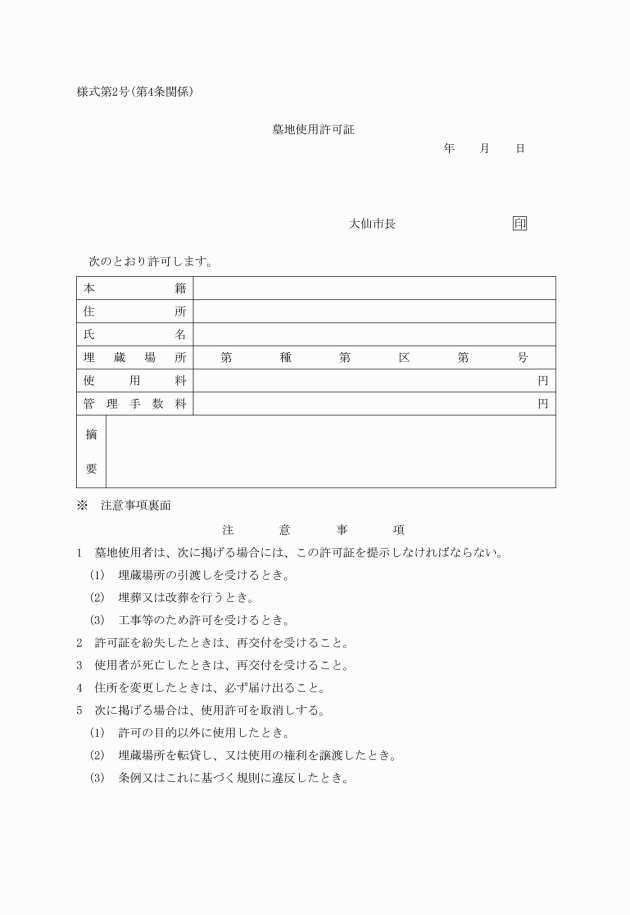 第5条 使用許可を受けた墓地に、墓標、さく類などの工作物を施設し、又は施設した工作物を変更しようとする者は、施設工事許可申請書(様式第3号)に設計図面その他必要な書類を添えて市長に提出し、許可を受けなければならない。