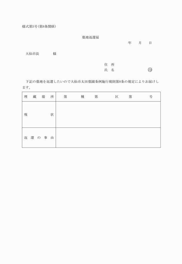 第9条 条例第12条第3項ただし書の規定により墓地の使用料の還付を受けようとする者は、墓地使用料還付申請書(様式第6号)を市長に提出しなければならない。