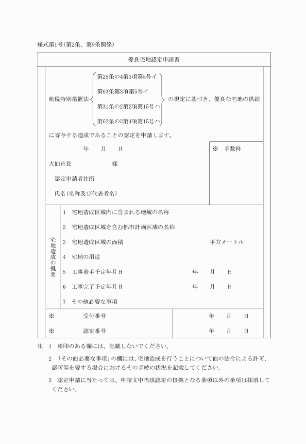 第2条 法第28条の4第3項第5号イ、第63条第3項第5号イ、第31条の2第2項第15号ハ又は第62条の3第4項第15号ハの規定に基づく認定(以下「優良宅地の認定」という。)を受けようとする者は、宅地の造成に着手する前に優良宅地認定申請書(様式第1号)を市長に提出しなければならない。