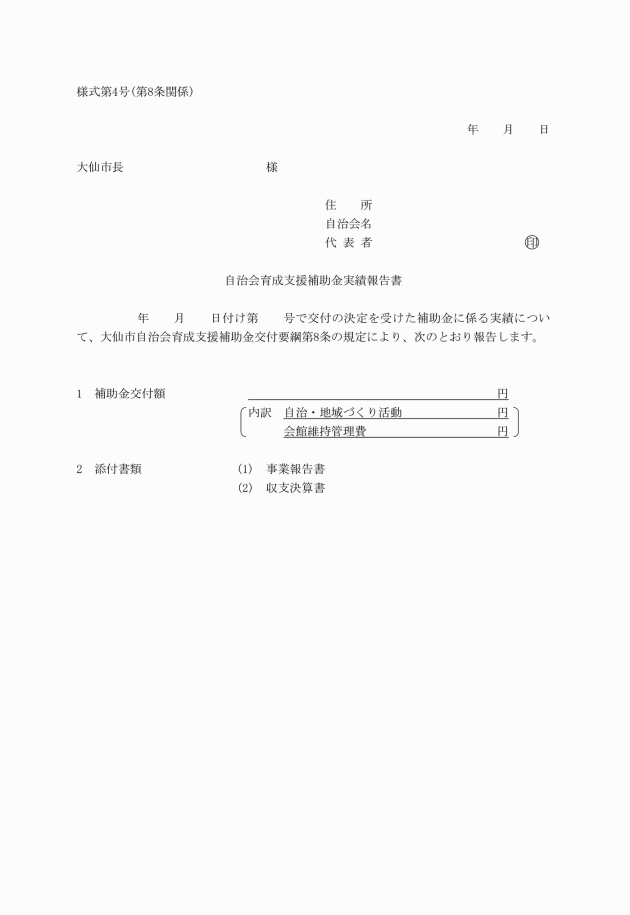 第8条 補助金の交付を受けた自治会は、当該自治会の会計年度終了後3箇月以内に、自治会育成支援補助金実績報告書(様式第4号)に事業報告書及び収支決算書を添えて、市長に提出しなければならない。