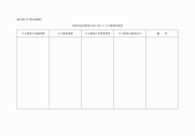 第2条 市長は、毎年度家庭用品品質表示法に基づく立入検査計画書(様式第1号)を作成し、立入検査を実施するものとする。