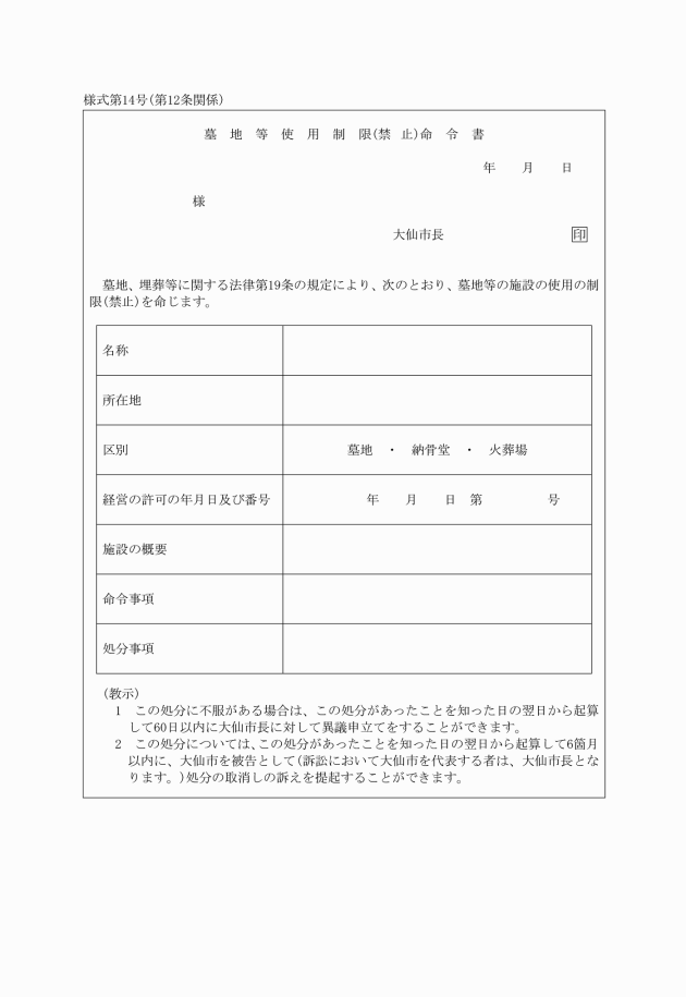 (2) 墓地等の使用の制限又は禁止の命令を行う命令書 墓地等使用制限(禁止)命令書(様式第14号)