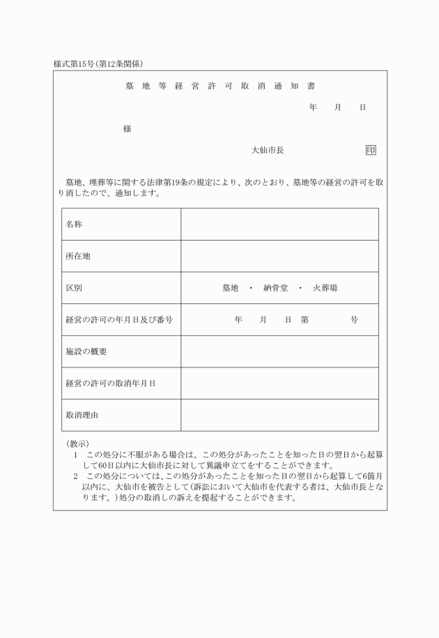 (3) 墓地等の経営許可を取り消す通知書 墓地等経営許可取消通知書(様式第15号)