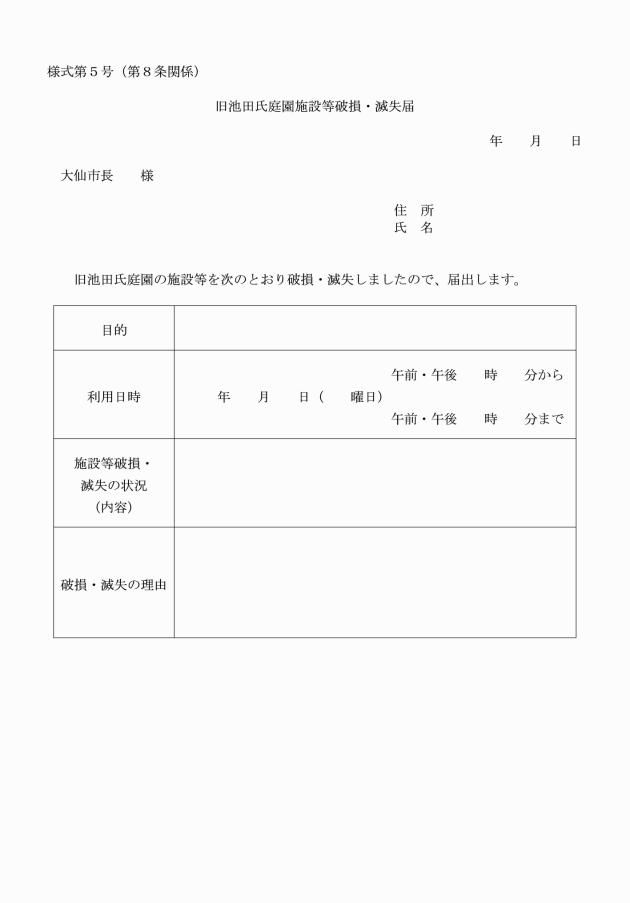 第8条 入園者又は利用者は、施設、付属設備又は展示物を破損し、又は滅失したときは、直ちに旧池田氏庭園施設等破損・滅失届(様式第5号)を市長に提出し、指示を受けなければならない。