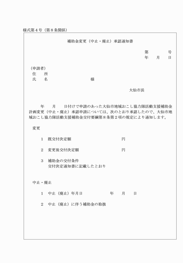 第8条 補助金の交付決定を受けた協力隊員は、事業の内容を変更し、又は事業を中止し、若しくは廃止する場合は、あらかじめ大仙市地域おこし協力隊活動支援補助金計画変更(中止・廃止)承認申請書(様式第3号)により、市長に申請しなければならない。